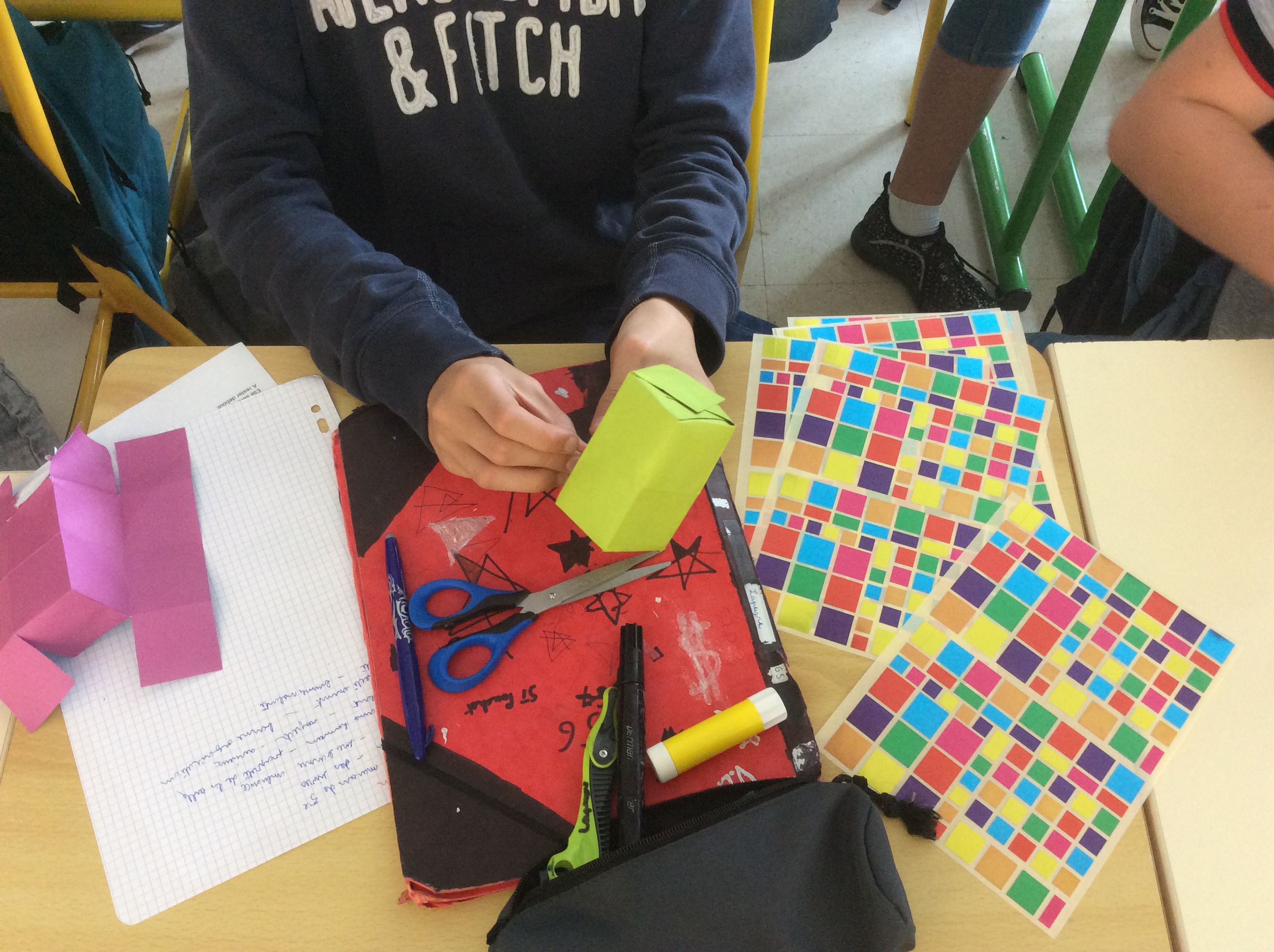 -en 5ème, les élèves ont construit leur petite maison de papier abritant les valeurs qu’ils souhaitent porter et partager pour leur année au collège (accueil, respect, organisation….)