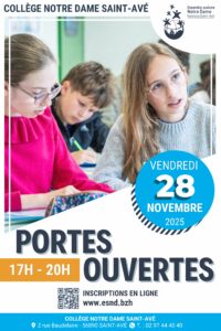 Les portes ouvertes du collège Notre Dame St Avé auront lieu le vendredi 28 novembre 2025 de 17h à 20h.